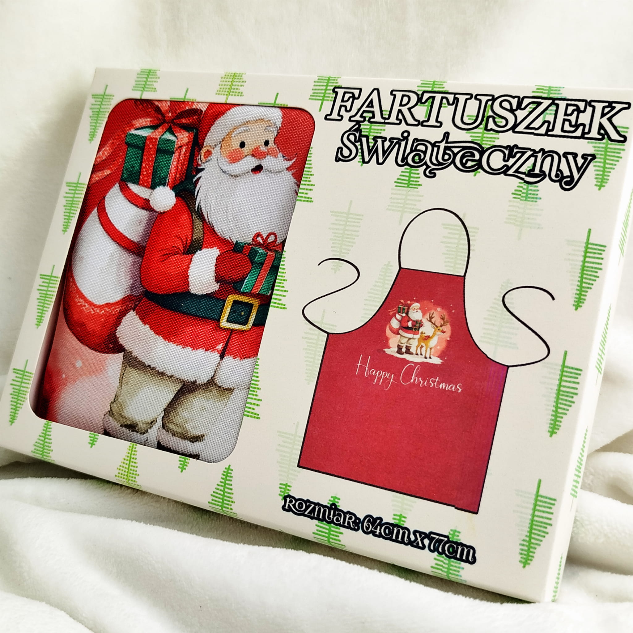 * dodatkowo każdy fartuszek zapakowany jest w dopasowany kartonik ze świątecznym motywem, dzięki czemu jest gotowy do wręczenia jako prezent – bez konieczności dodatkowego pakowania
