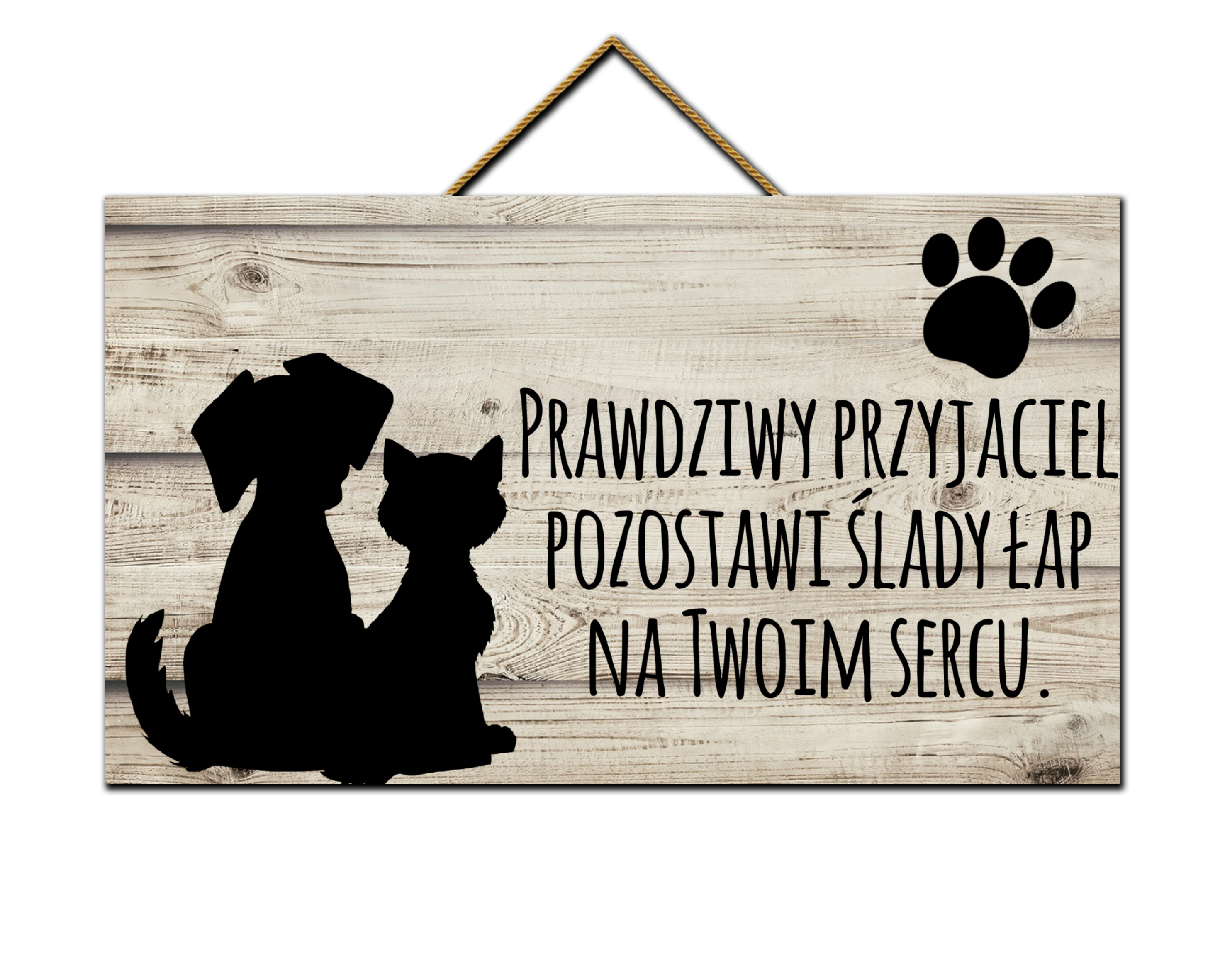 Nadruk wykonany bardzo trwałą metodą UV na płycie HDF (3 mm grubości). Tabliczka posiada sznurek naturalny.